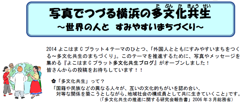 よこはまCプラット 多文化共生キャンペーン「多文化共生ブログ」(愛称:「共(とも)♡ログ」)へようこそ。 このブログは、2014年度よこはま国際協力・国際交流プラットフォーム(よこはまCプラット)事業のテーマのひとつ「外国人とともにすみやすいまちをつくる~多文化共生のまちづくり」を推進するための、みんなで作る写真・メッセージ集です。皆さんからの投稿をお待ちしています!