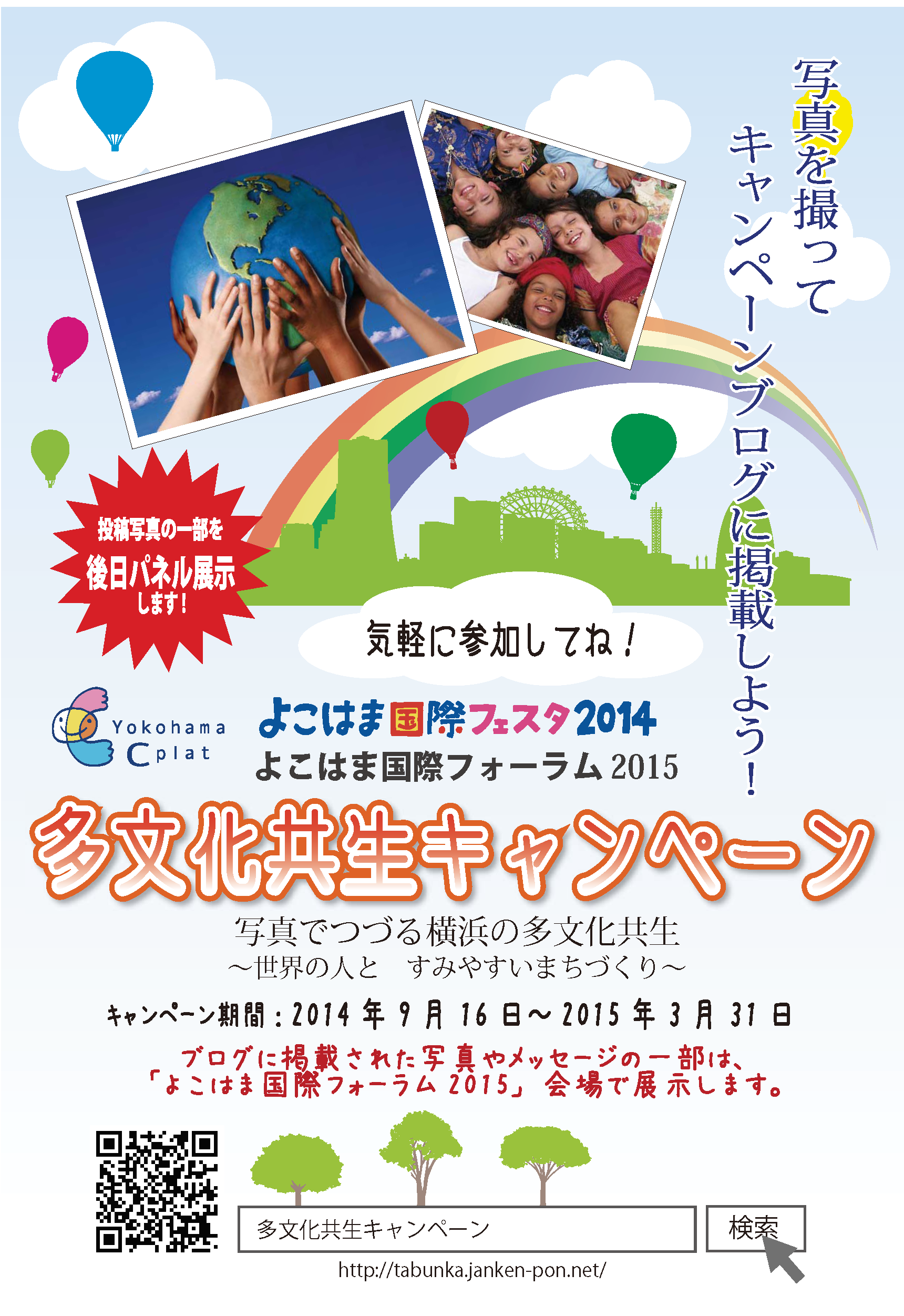 よこはまCプラット 多文化共生キャンペーン「多文化共生ブログ」(愛称:「共(とも)♡ログ」)へようこそ。 このブログは、2014年度よこはま国際協力・国際交流プラットフォーム(よこはまCプラット)事業のテーマのひとつ「外国人とともにすみやすいまちをつくる~多文化共生のまちづくり」を推進するための、みんなで作る写真・メッセージ集です。皆さんからの投稿をお待ちしています!