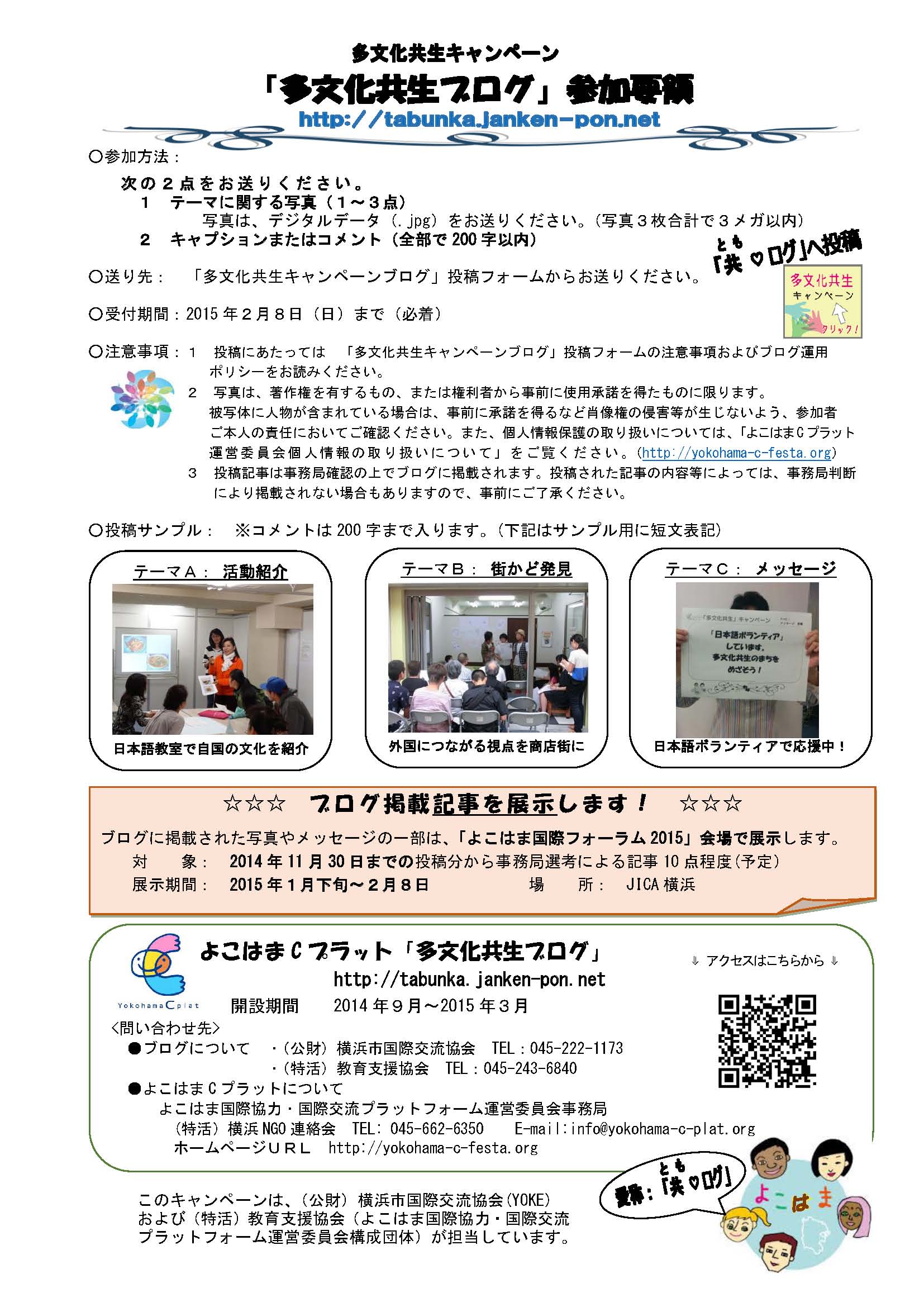 よこはまCプラット 多文化共生キャンペーン「多文化共生ブログ」(愛称:「共(とも)♡ログ」)へようこそ。 このブログは、2014年度よこはま国際協力・国際交流プラットフォーム(よこはまCプラット)事業のテーマのひとつ「外国人とともにすみやすいまちをつくる~多文化共生のまちづくり」を推進するための、みんなで作る写真・メッセージ集です。皆さんからの投稿をお待ちしています!